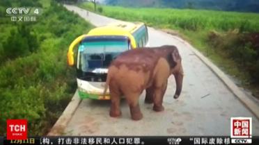 Дикий слон напав на автобус посеред дороги. Це сталося у китайській провінції Юньнань. Тварина штовхала автобус, що з’явився на його шляху, щосили, аж поки не розбила лобове скло. Потім слон переключив свою увагу на вантажівку. І теж добре її зім’яв. На щастя, ніхто не постраждав.
