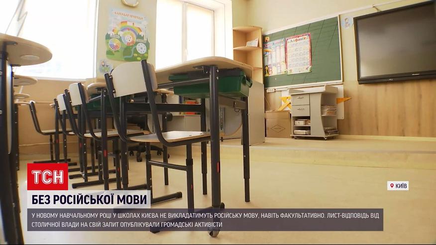 У новому навчальному році у столичних школах більше не викладатимуть російську мову, навіть факультативно. Лист-відповідь від столичної влади на свій запит опублікували громадські активісти та пообіцяли проконтролювати виконання норми. Столиця - не перша, хто виступив із такою ініціативою. Раніше від російської відмовилися у школах Львова, Житомира та Миколаєва. Водночас освітній омбудсмен заявив, що дитина теоретично може вивчати російську у школі, якщо її батьки вважають себе етнічними росіянами і проситимуть дирекцію школи про такий предмет. Таку можливість передбачає закон про нацменшини і прямої заборони російської наразі немає.