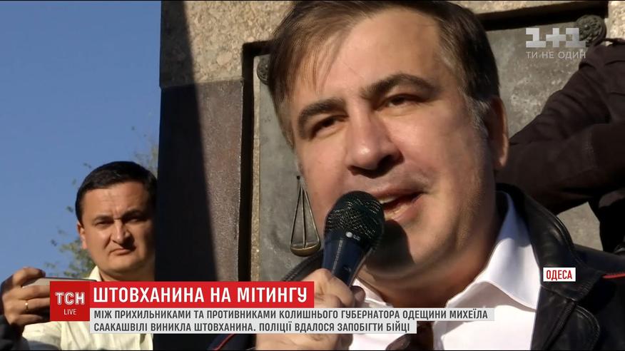 Його активісти приїхали до пам'ятника Дюку, де саме розпочинався мітинг, у масках Саакашвілі і увімкнули гучну музику. Це обурило учасників мітингу. Кілька десятків людей ринулися, щоб вимкнути звук силоміць. Виникла штовханина. Вгамовувала сторони поліція.