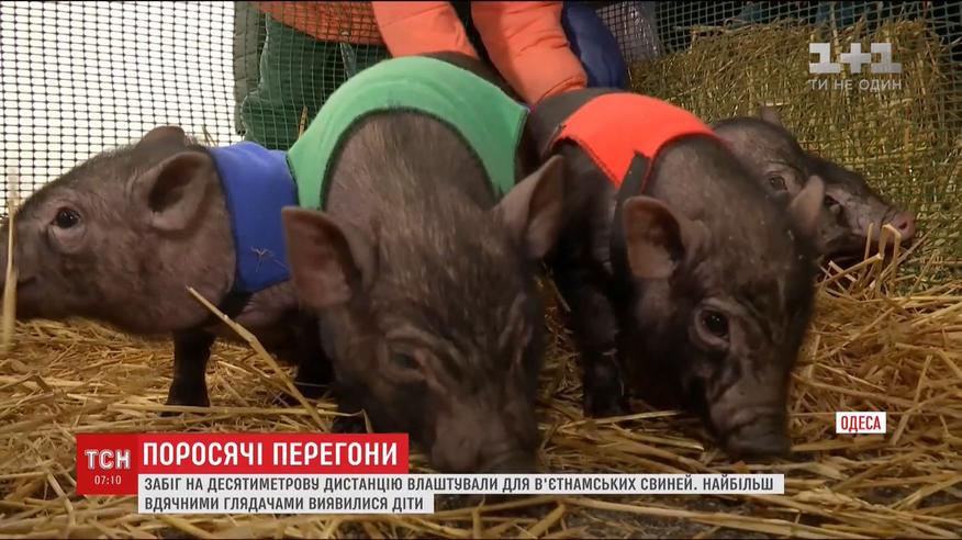 Під оплески публіки п'ятеро поросяток в різнокольорових камізельках долали десятиметрову дистанцію. Бігти хотіли не всі, тож організаторам доводилось їх трохи підганяти. А до фінішу тваринки здебільшого приходили гуртом.