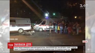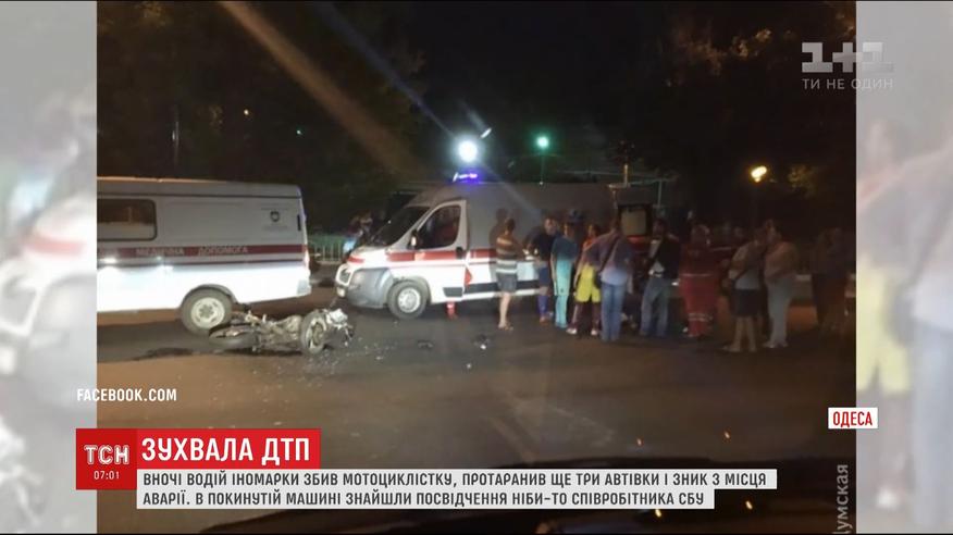 Розбиту іномарку чоловік покинув у кущах. Пізніше поліція знайшла в салоні документ, схожий на посвідчення співробітника СБУ, втім у ньому є граматичні огріхи. Потерпілу мотоциклістку доправили до лікарні з переломом руки та черепно-мозковою травмою.