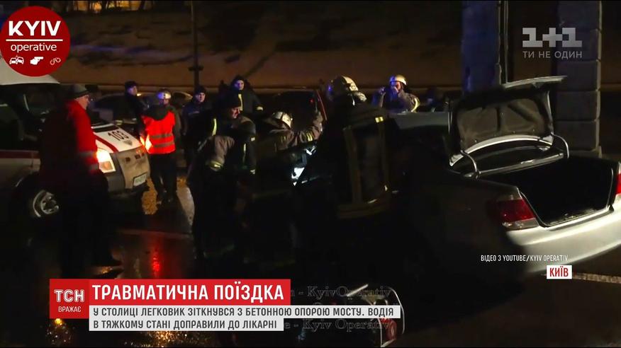 Купа брухту залишилась від легковика після зіткнення з бетонною опорою. Аварія сталося сьогодні вночі на столичному проспекті Перемоги. Свідки кажуть, що водій легкового автомобіля їхав на величезній швидкості, не впорався з керуванням і врізався в опору мосту. Від зіткнення авто відкинуло на кілька метрів, а 28-річного водія заблокувало всередині. Його діставали рятувальники. Потерпілого одразу доправили до лікарні у тяжкому стані.