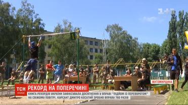 760 підйомів із переворотом на свіжому повітрі зробив курсант Житомирського військового інституту Дмитро Косатий. Наприкінці травня він виконав цю вправу 1001 раз. Але тоді Книга рекордів це ще не фіксувала. Цього разу курсант намагався побити світовий рекорд - 1400 разів. Але поперечину розмістили на відкритому сонці за температури у плюс 30. Тому за 4,5 години через жарінь курсант усе ж зупинив вправу. Але досягнення представники Книги рекордів України таки зафіксували.