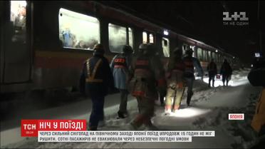 Через сильний снігопад застрягли колеса. Людей вирішили не евакуювати через небезпечні погодні умови за вікном. З поїзда вивели лише кількох пасажирів, які погано почувалися. Упродовж 15 годин люди чекали, поки негода відступить, і лише вранці поїзд відновив рух.