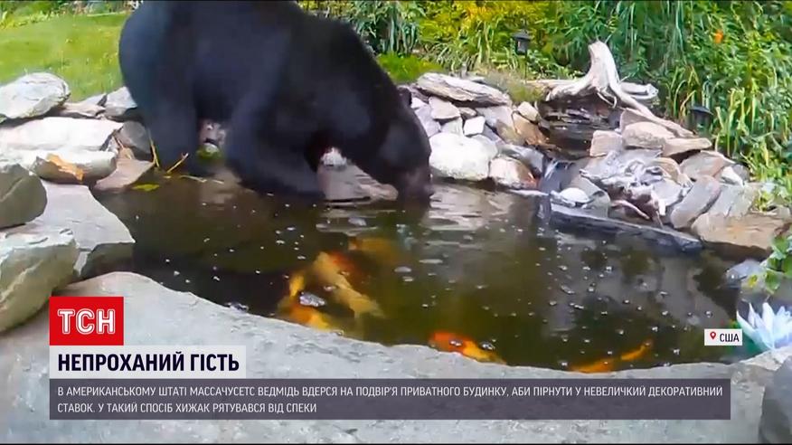 Непроханий гість у пошуках прохолоди. В американському штаті Массачусетс чорний ведмідь вдерся у двір будинку, аби пірнути у невеличкий декоративний ставок. У воді хижак хотів охолодитися від літньої спеки, от тільки не очікував, що там уже хтось є – декоративні коропи. Клишоногий спершу намагався зрозуміти й розгледіти, що ж це за риба, але швидко втік.