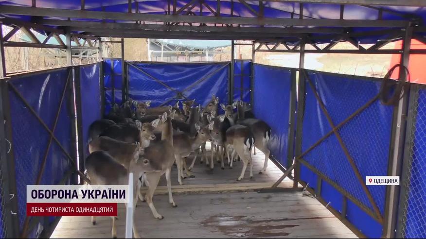 20 європейських ланей та 20 благородних Оленів прибули на Білгородський острів української дельти Дунаю. Щоби полохливі тварини не злякалися води, бокові частини судна закрили тентами. Тільки-но воно причалило до острова, - звірі відразу вистрибнули на берег. Як вони там приживуться - екологи знатимуть завдяки спеціальному пристрою, який причепили на одну із тварин.