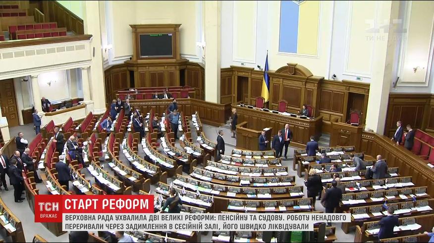 Депутати ухвалили пенсійну та судову реформу. І це попри те, що роботу довелося переривати і викликАти пожежників. В одному з кутків залу для голосувань закоротило дроти. Депутатів налякав запах горілої проводки.
