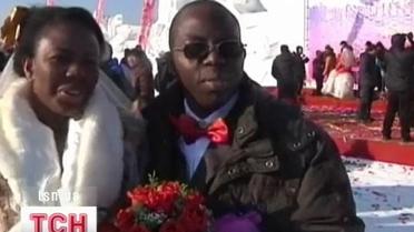 У Китайському сніговому парку, який відкрили тільки вчора, сьогодні вже побралися 18 пар. Учасників церемонії зігрівали не лише гарячі почуття - щоби не змерзнути, наречені разом із весільними сукнями вдягли теплий одяг та взуття.
