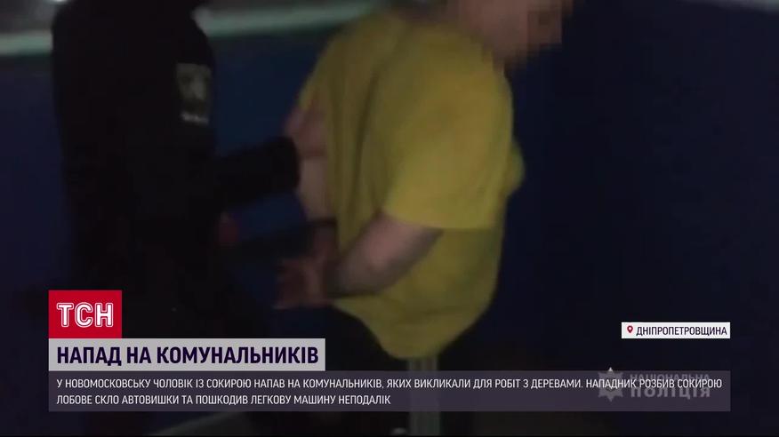 У Новомосковську на Дніпропетровщині затримали чоловіка, який влаштував напад на працівників. Усе сталося на подвір’ї багатоповерхівки. Люди викликали комунальників, аби ті омолодили великі тополі. Аж раптом з’явився чоловік із сокирою, якою він розбив лобове скло в кабіні автовишки. І пошкодив легкове авто, що стояло поруч. Комунальникам вдалося втекти від нападника. Вони не постраждали. Що спричинило напад агресії, 46-річний житель Новомосковська пояснити не зміг.