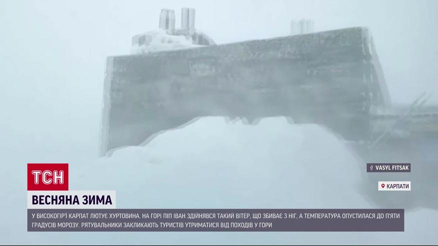 Зима не відступає у високогір’ї Карпат. Там лютує хуртовина. На горі Піп Іван Чорногірський здійнявся такий вітер, що людей збиває з ніг, а температура опустилася до 5 градусів морозу. Надзвичайники закликають туристів утриматися від походів у гори, бо через заметіль там мінімальна видимість, і легко збитися з дороги.