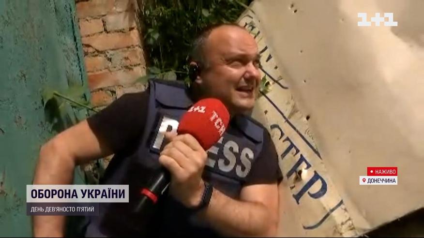 Вибухи просто в прямому ефірі ТСН. Знімальна група ТСН у Бахмуті Донецької області потрапила під обстріли ракет. Це відбулося в ефірі телемарафону, який дивиться вся Україна. Журналісту Олександру Загородньому та оператору Івану Головачу довелося тікати в укриття.