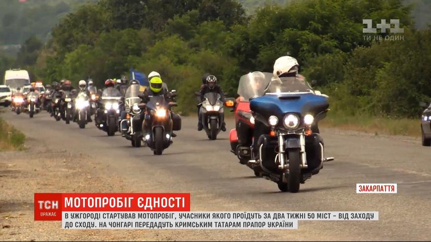 В Ужгороді стартував "Мотопробіг єдності". Байкери планують за два тижні проїхати всю Україну - із Заходу на Схід і з Півночі на Південь. Відвідати понад 50 українських міст і на Чонгарі передати прапор України кримським татарам. Кореспондент ТСН також здолав частину шляху на мотоциклі. Крім загальної мети єднання, він здійснює свою мандрівку заради нашого хворого колеги Олега Тудана.