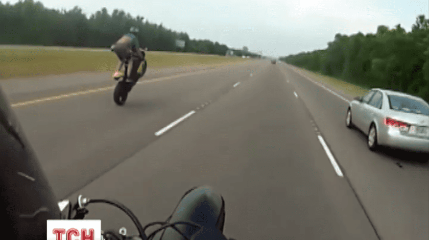 Страхітливий інцидент зафіксувала камера відео-реєстратора. На швидкості понад сотню кілометрів на годину чоловік вирішив виконати екстремальний трюк – і поставити свій мотоцикл на заднє колесо. Утім, із залізним конем екстремал не впорався - втратив керування і злетів на узбіччя. Від смерті горе-трюкача врятував шолом.