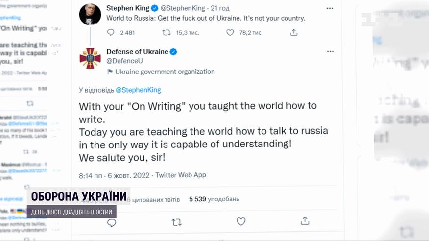 Послав курсом російського корабля росіян і отримав вподобайку від українського Міноборони - відомий американський письменник Стівен Кінг вчергове підтримав нашу державу. У своєму Твіттері він написав: "Світ Росії - забирайтеся з України. Це - не ваша країна". За свою позицію король жахів отримав схвальний коментар від українського Міністерства оборони. Там зазначили, що Стівен Кінг своєю працею навчив світ, як писати, а нині вчить світ як розмовляти з Росією єдиним зрозумілим для неї способом.