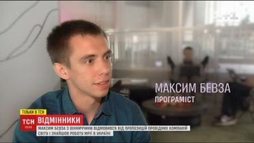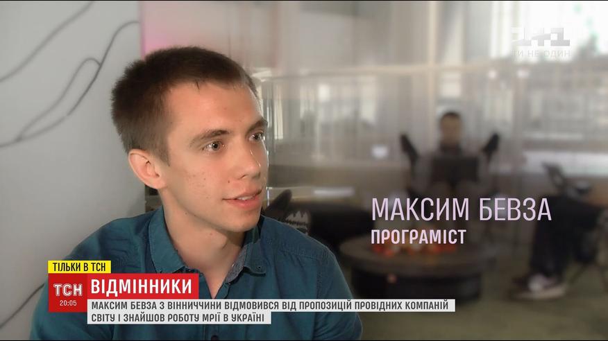 Герой наступного сюжету проекту "Відмінники" – Максим Бевза. Хлопець з містечка на Вінниччині здав ЗНО на 200 балів і зайшов так далеко, що йому пропонували роботу найкращі компанії світу, серед яких Google і Facebook. Але хлопець вирішив залишитися і знайти роботу мрії в Україні.