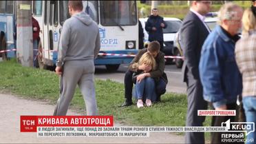 Восьмеро загиблих і понад два десятки потерпілих, четверо - на межі життя і смерті. Сталося це близько шостої ранку на перехресті в центрі міста. Уже відомо, що водій "Мазди" не поступився маршрутці, яка рухалася головною дорогою, а ту відкинуло на зустрічний автобус.