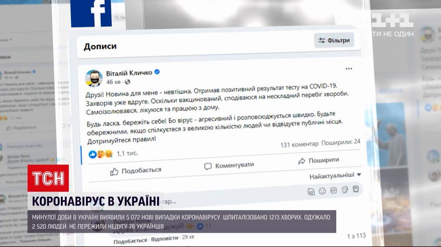 Вдруге захворів на коронавірус мер Києва Віталій Кличко. Про це очільник міста повідомив сам у "Фейсбуці". Написав, що пішов на самоізоляцію, але буде продовжувати працювати з дому. І сподівається, дві вакцини допоможуть легко перенести недугу. Загалом в Україні за тиждень виявили трохи більше 5 тисяч нових випадків коронавірусу. Із ускладненнями до лікарень шпиталізовано 1213 хворих. 78 українців недугу не пережили.