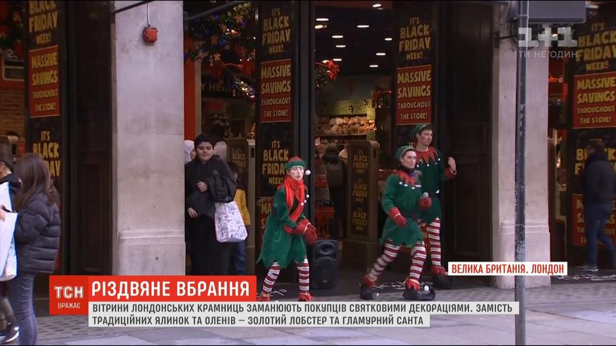Замість традиційних ялинок, санчат і оленів, цього року в елітному універмазі танцює гігантський морський рак, а біля дитячого магазину - справжні ельфи. В іншій крамниці Санта-Клаус змінив звичний кожух на гламурне сценічне вбрання. За словами експертів, цього року британці витрачатимуть на Різдво менше, бо хвилюються через вихід королівства з ЄС та стан економіки.
