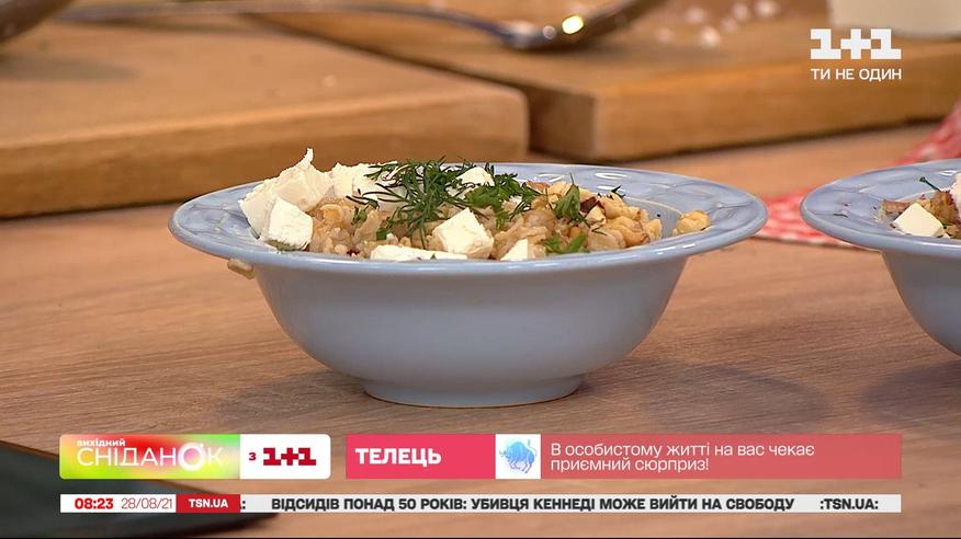 Друзі, а в нас сьогодні буде здоровий і майже традиційний сніданок – вівсянка. Знаємо, що найчастіше її готують із фруктами та цукром і ця страва перетворюється на невимушений ранковий десерт. Але сьогодні ми пропонуємо приготувати вам солону вівсянку з фетою і горіхами. Інгредієнти ви бачите на екрані. Вівсяні пластівці, сир фета, горіхи, оливкова олія, сіль та перець.