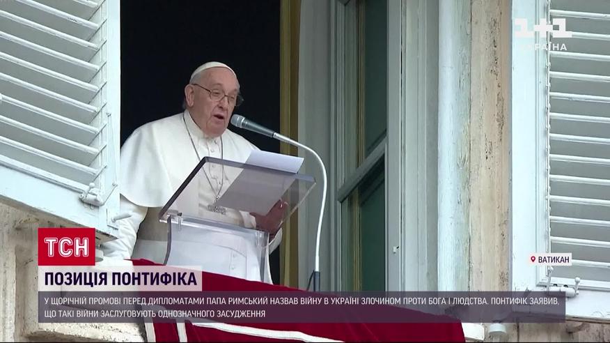 Папа Римський назвав війну в Україні злочином проти Бога і людства. У щорічній промові перед дипломатами, акредитованими в Ватикані, Франциск Перший заявив, що такі війни, де цивільні території зазнають безладного знищення, заслуговують твердого і однозначного засудження.