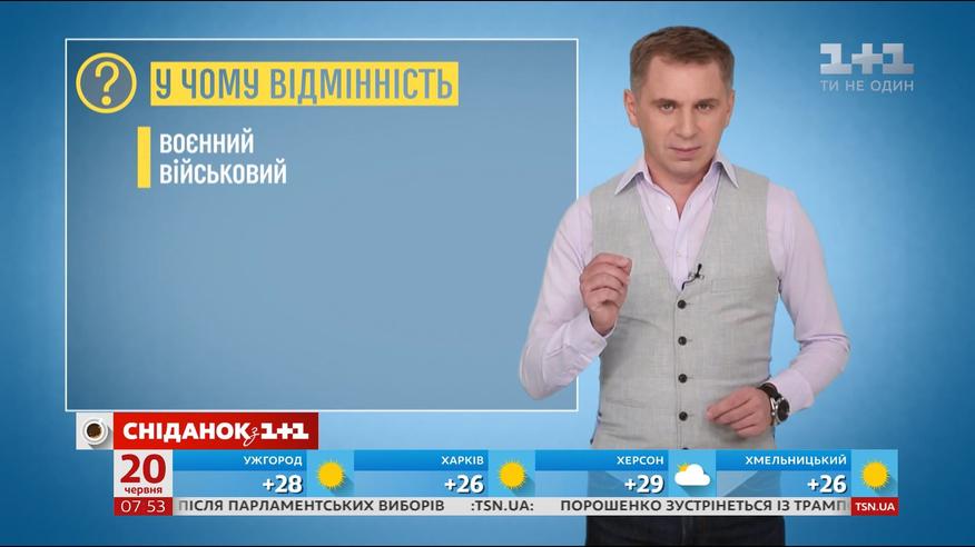 ТСН Відео Дата публікації 10:20, 20.06.17 Категорія Відео Кількість переглядів 73 Військовий чи воєнний - експрес-урок Військовий чи воєнний? Мовний експерт Олександр Авраменко розповів, чи є відмінність між цими словами.