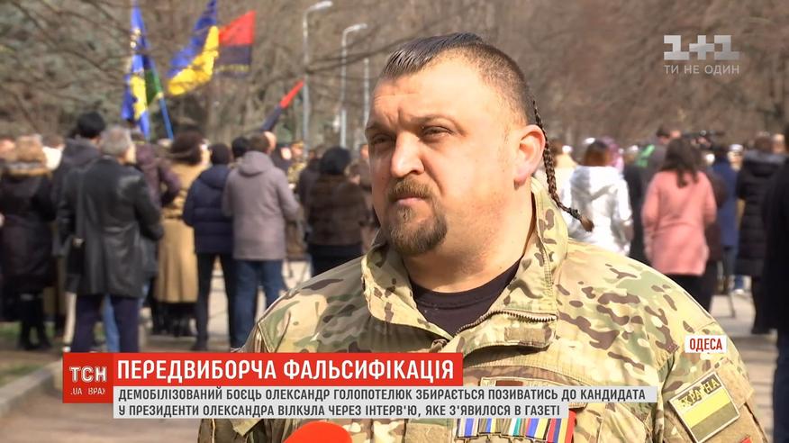 В Одесі демобілізований боєць збирається позиватись до кандидатом у президенти Олександра Вілкула за незаконне використання свого фото і публікацію інтерв’ю, якого насправді у нього не брали. У ньому йдеться, нібито боєць закликає голосувати за Вілкула, а це не відповідає дійсності.
