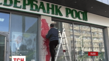 У фінустанову жбурляли скляними ємностями з червоною фарбою. А вже зранку до інших відділень банку Росії з пікетом прийшли представники громадської ініціативи "Бойкот російським товарам".