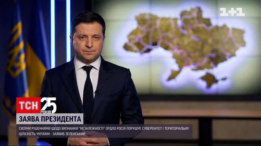 "Ми давно й до всього готові. Жодних причин для хаотичних дій з боку України немає", - з такими словами президент Зеленський звернувся уночі до українців на тлі визнання Росією самопроголошених "ДНР" та "ЛНР" та рішення Путіна про введення туди російського війська. В такий спосіб, за словами Зеленського, Кремль лише легалізував своїх солдатів на окупованих територіях Донбасу. Все це, додав президент, може означати односторонній вихід Росії з Мінських угод та ігнорування рішень в рамках "Нормандії".