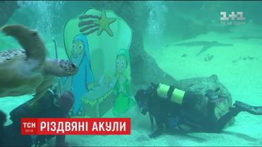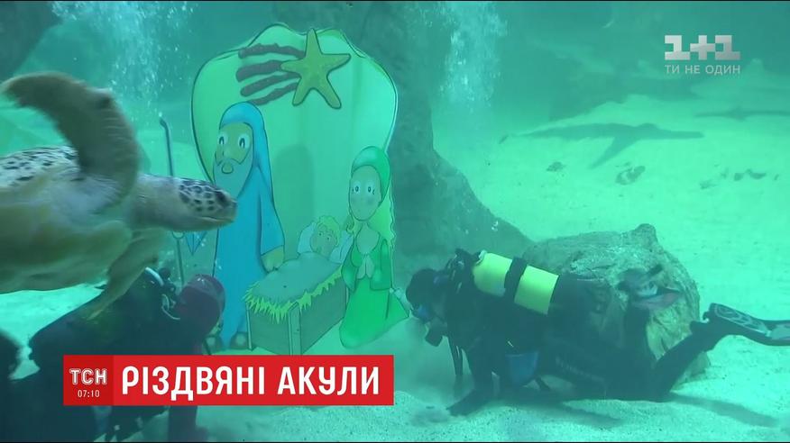 Для цього вони наважилися зануритися у ємність, де живуть п’ять різних видів морських хижаків. За тим, що відбувається на дні, також спостерігали скати і черепахи. Вітати морських тварин із Різдвом вже стало традицією.