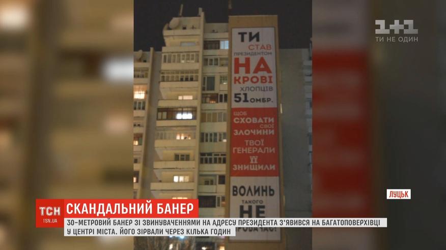 Величезний 30-метровий банер з таким підписом з'явився у центрі Луцька напередодні візиту президента України на Волинь. Провисів він усього кілька годин, бо посеред ночі його зірвали.
