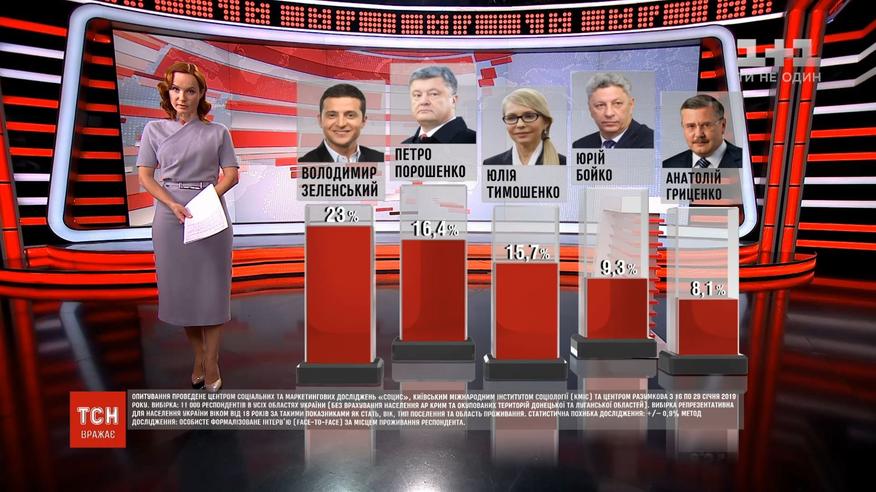 Про це свідчать одразу два опитуванння, проведених у другій половині січня. Центр Разумкова, Київський міжнародний інститут соціології та центр "Соціс" дають такі цифри. Серед громадян за керівника "Кварталу-95" свої голоси готові віддати 23%, за чинного главу держави – 16,4%, за лідерку партії "Батьківщина" – 15,7% виборців. Інші кандидати набирають менше 10%.