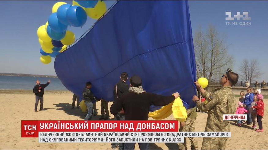 Величезний прапор України у ці хвилини майорить над окупованими територіями. Волонтери разом з військовими запустили його на повітряних кулях. Планували, що прапор полетить на окуповану Горлівку, але він вибрав собі більше місто. Наступна повітряна бандероль полетіла з жовто-блакитними стрічками та листівками.