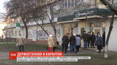 Під час карантину в Україні працюють банки, пенсійні фонди, центри надання адміністративних послуг і сервісні центри. Щоправда, за новими правилами: у приміщення пускають по дві людини, інші мусять чекати на вулиці. При цьому всі - у медичних масках. Більше про коронавірус в Україні