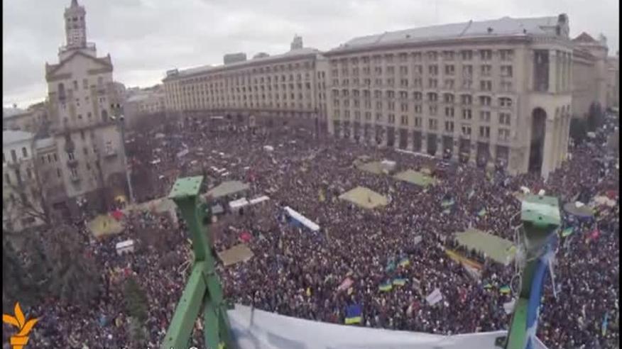 Журналіст "Радіо" Свобода "Андрій Дубчак зняв недільний Євромайдан з висоти недобудованої головної ялинки на Майдані Незалежності. На відео видно, що площа і Хрещатик вщент заповнені людьми, які з прапорами України і ЄС прийшли підтримати курс на Європу.