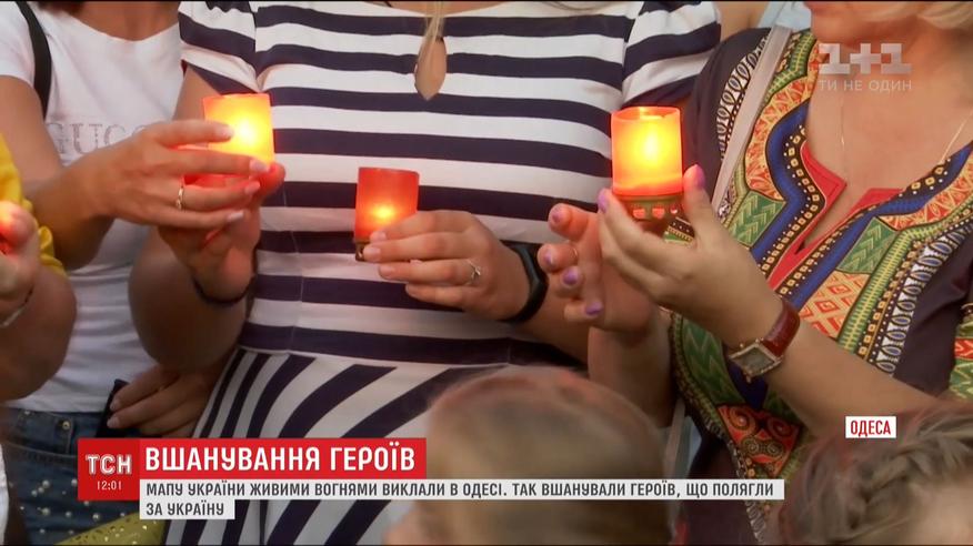 В Одесі карту України виклали живими вогниками на згадку про тих, хто віддав життя за незалежність. Жовто-блакитний букет поклали на тому місці, де на мапі позначені Луганщина та Донеччина. Саме там загинули найбільше захисників держави.