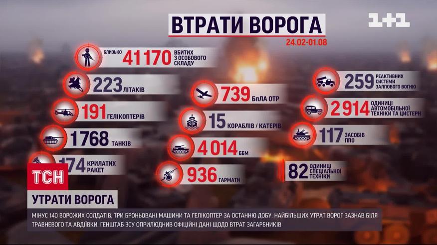 Мінус 140 окупантів лише за 1 серпня. Загалом від початку повномасштабного вторгнення ліквідовано 41 170 російських солдатів. До брухту за добу додалося 3 їхні бойові броньовані машини, 4 артсистеми та 3 безпілотники. І ще мінус ворожий гелікоптер. Також знищено дві цистерни з пальним.