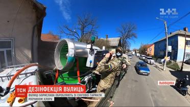 Дезінфекція вулиць зі снігової гармати. У місті Борислав у Львівській області розчин хлору почали розпилювати зі снігової техніки. Ідею та саму техніку надав власник одного з гірськолижних курортів. Гармата не лише ефективна, але й економна - дезрозчину витрачає в 4 рази менше. Більше про коронавірус в Україні