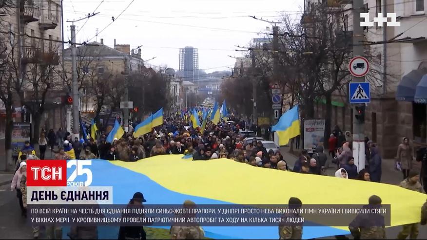 Синьо-жовті прапори на честь Дня єднання сьогодні підняли по всій країні. В Миколаєві у сквері юних героїв зібралися сотні людей. Там піднімали найбільший прапор області. У Дніпрі у вікнах мерії вивісили триста стягів і разом з ансамблем виконали просто неба Гімн України. У Кропивницькому День єднання відзначили патріотичним автопробігом та ходом. Долучитися до марафону єдності закликають усіх українців - публікувати дописи в соцмережах із хештегом #UAРазом. До марафону доєдналися і працівники "1+1 медіа". Більше про те, як українці святкують День єднання – дивіться у ТСН.