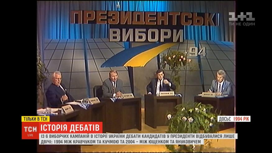 Дебати головних претендентів на президентську булаву в Україні наразі відбувалися двічі: у 1994 році між Леонідом Кравчуком та Леонідом Кучмою, та через 10 років між Віктором Ющенком та Віктором Януковичем. Частіше кандидати все ж таки знаходили приводи не вести дискусію віч-на-віч.