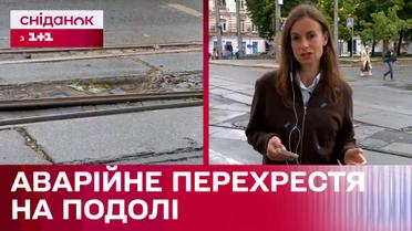 Традиційна "Погода з ями". Перехрестя вулиць Верхній Вал і Межигірська. Тут асфальт став дірявим на стиках трамвайних колій, яким вже не було до чого чіплятися. Автомобілі, які також перетинають це перехрестя в тому числі по коліях, були змушені або маневрувати, або скакати в цю яму. Як вирішили проблему комунальники і чому довелося звертатися до них знову?