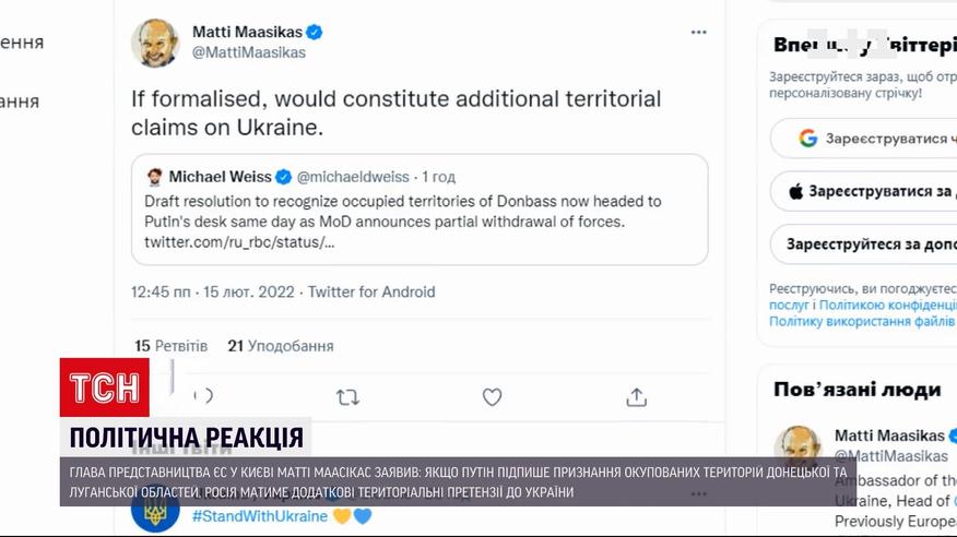 І маємо першу реакцію європейських дипломатів на рішення російської Думи - у твіттері відреагував глава представництва ЄС у Києві Матті Маасікас. Він зазначив: якщо Путін таки визнає незалежність окупованих територій Донецької та Луганської областей - у Москви можуть виникнути додаткові територіальні претензії до України.