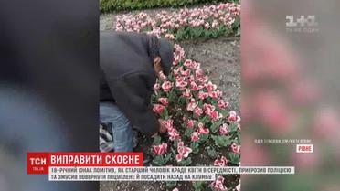 18-річний хлопець помітив, як той краде квіти з клумби, наздогнав і пригрозив поліцією. Потім наполегливо попросив повернути все на місце. І присоромлений чоловік почав прикопувати цибулини у ґрунті. Відео хлопець поширив соцмережею і свій вчинок пояснив тим, що не зміг лишатися осторонь, коли паплюжили його місто.