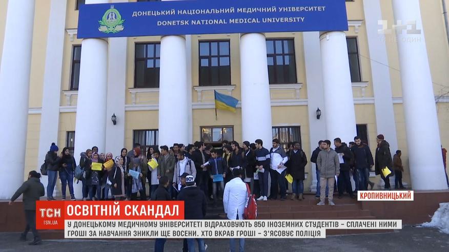 Освітній скандал у Кропивницькому набирає обертів. 850 студентів із двох десятків країн, які напередодні протестували під стінами ректорату Донецького національного медичного університету, відрахували з вишу. Студенти вимагали втрутитися, куди поділися вже сплачені ними за навчання гроші.