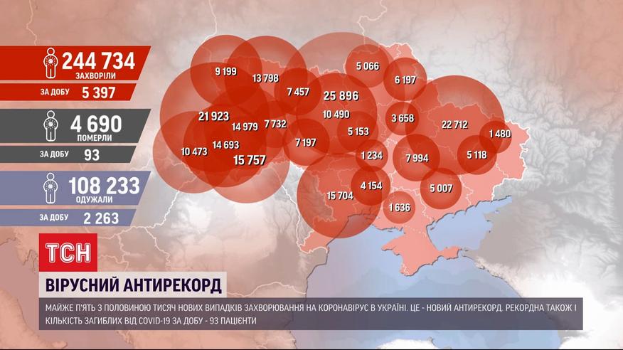 5397 нових випадків інфікованих на коронавірус за добу. Це останні дані від РНБО. Попередній антирекорд, встановлений лише вчора, перевершено майже на 600 нових коронавірусних діагнозів. Також від початку епідемії маємо найвищу смертність від Covid-19 за добу - померли 93 пацієнти.