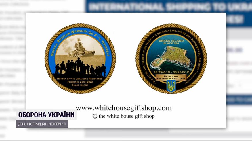 Білий дім випустив колекційну монету, присвячену захисникам Зміїного. Подивитися на дизайн уже зараз можна на сайті сувенірного магазину Білого дому. В описі до монети - історія захоплення Росією острова та українських моряків і знаменита фраза одного із захисників острова, який направив за відомою адресою російський військовий корабель. Копійка коштує 100 доларів, покупцям з України та країн НАТО її доставлять безкоштовно, а 20% від продажу витратять на допомогу українським жінкам та дітям.