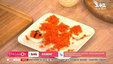 За традицією тижня поповнюємо нашу скарбничку рецептами новорічних закусок. Сьогодні приготуємо фаршировані яйця, стилізовані під символ прийдешнього року - тигра. А називається закуска "тигрові вушка". Нам знадобиться: тунець, варені яйця, варена морква, цибуля, маслини, трохи майонезу і солі.