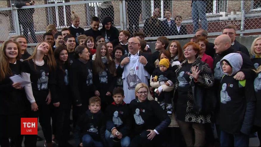 У 38-му ліцеї столиці учні, випускники та батьки влаштували оригінальне шоу. Вони одягли футболки із зображеннями викладачів, які в цей день святкують круглі дати своєї роботи у навчальному закладі. А також підготували авторського вірша.