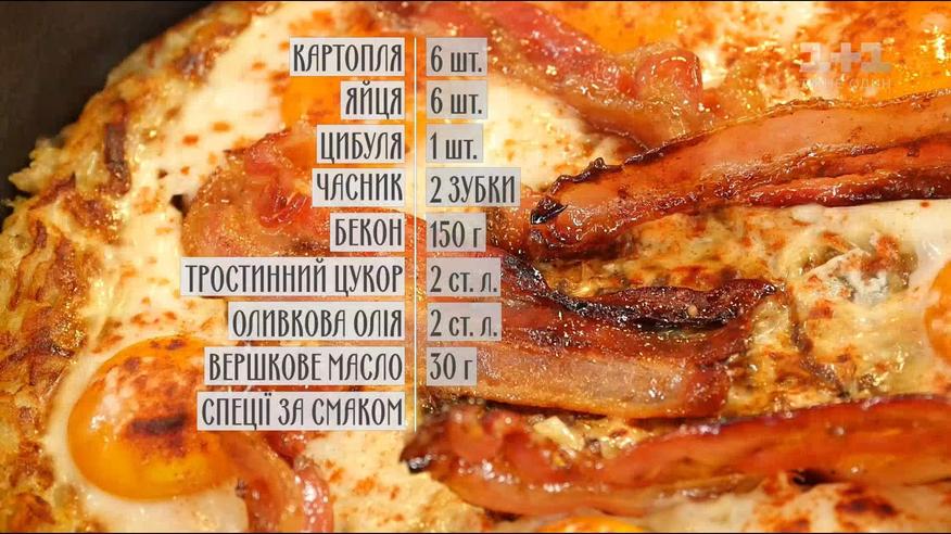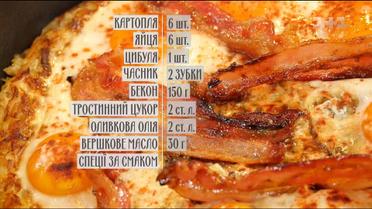 Хіба може набриднути картопля? Адже страв із нею можна приготувати просто неймовірну кількість! У нас є дуже цікавий, вам знадобиться: картопля - 6 шт., яйця - 6 шт., цибуля - 1 шт., часник - 2 зубки, бекон - 150 г, тростинний цукор - 2 ст. л., оливкова олія - 2 ст. л., вершкове масло - 30 г, спеції за смаком.