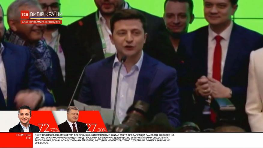 Кандидат у президенти Володимир Зеленський виступив у Facebook із першою промовою після оприлюднення результатів екзит-полів. Він подякував батькам, дружині та "Кварталу 95".