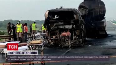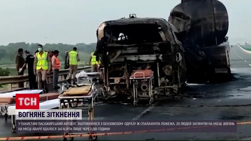 20 людей загинули в Пакистані. Там пасажирський автобус зіткнувся з бензовозом. Одразу ж спалахнула пожежа. Загасити вогонь удалося лише за дві години. Шістьох пасажирів урятували, вони у шпиталі. Один зі щасливців розповідає: те, що він вижив, справжнісіньке диво, бо "швидка" приїхала тільки за дві години після аварії. Каже, він та сусід по сидінню, вискочили з охопленого вогнем автобуса через розбите скло.